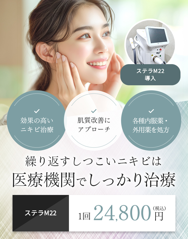 当院のニキビ治療では、各種機器、外用薬、内服薬などを用いて患者さま一人ひとりに適した方法をご提供させていただいております。ニキビができにくい肌質になるためのサポートも行い、根本から原因追及をしていきます。合わせて、ホームケア関連もご提案させていただきます。