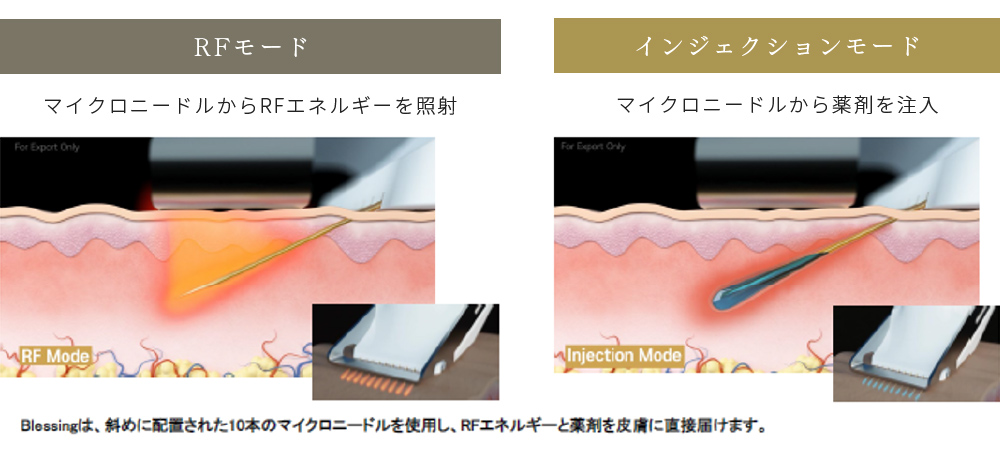 ブレッシング(BLESSING)とは、マイクロニードルを皮膚に対して斜めに進入させ、高周波(RF)エネルギーと薬剤を同時に届ける世界初のシステムであり、特許も取得しています。この技術により「RFエネルギーの広範囲照射」「薬剤ロスほぼゼロの高効率かつ安定した薬剤注入」「強力なサブシジョン効果」が実現されており、従来治療では不可能だった「肌組織そのものを再構築させる」という効果が得られます。