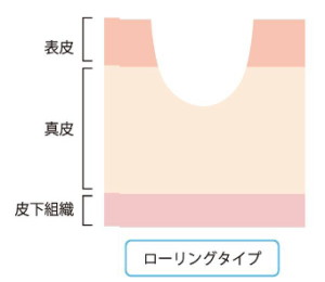 | ローリングスカー | 波状の浅い凹み | ブレッシング、キュアジェット、サブシジョン |