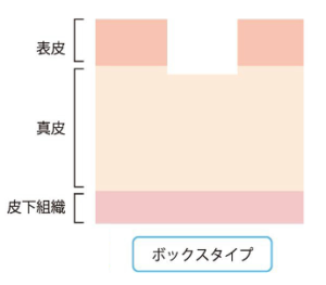 | ボックススカー | 幅広で底が平らな凹み | ブレッシング、キュアジェット、TCAクロス、CO2フラクショナル、CO2アブレージョン、ダーマペン、サブシジョン |