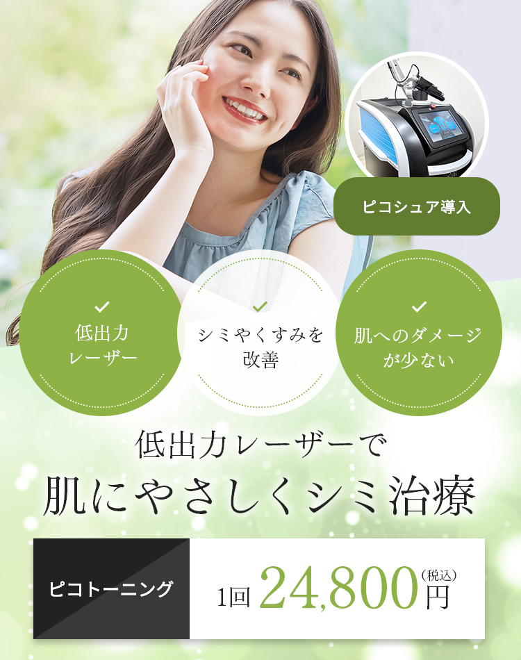 低出力レーザーを照射して、シミの原因となるメラニンを除去する治療です。ピコトーニングは、細かく薄いシミの治療に向いており、肝斑が悪化しない程度の低出力で照射することで、徐々に薄くする効果が期待できます。当院では、シミへの反応率が高いアレキサンドライトを搭載したピコシュアを導入しています。