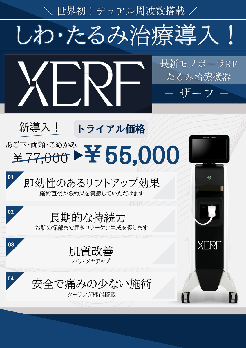 当院では、2種類の高周波エネルギーを使った新しいたるみ治療機器「XERF(ザーフ)」を導入しています。ザーフは、真皮から脂肪層までの深い部分にまで作用することができ、顔全体のたるみやフェイスラインのゆるみを、メスを使わずにしっかり引き締めることが可能です。切らないリフトアップをご希望の方におすすめの治療です。
