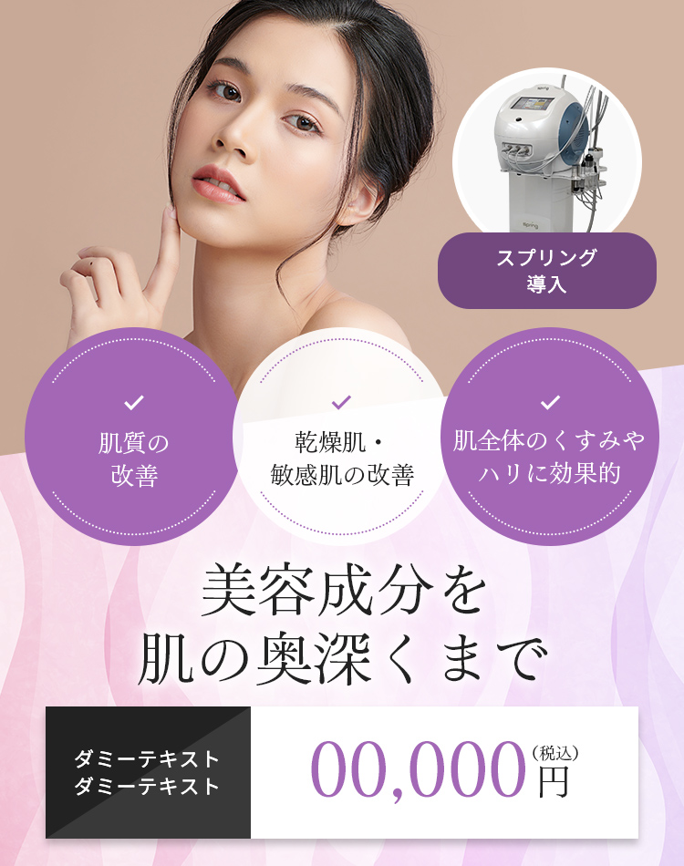 はい、肝斑治療としても非常に有効です。肝斑はデリケートなシミのため、刺激の少ない治療が求められます。スプリングは肌にやさしく、肝斑の改善に効果的なトラネキサム酸などの成分を効率的に導入できるため、肝斑にお悩みの方にも安心して受けていただけます。