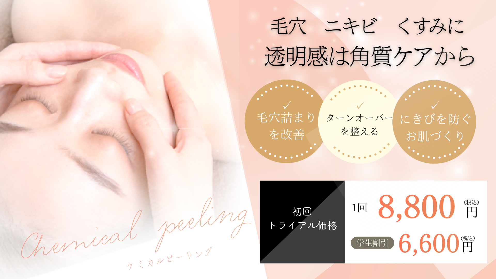 サリチル酸、グリコール酸、トリクロロ酢酸などの化学薬品を皮膚に塗布することで皮膚の表面を剥離する治療法です。 主にニキビ、毛孔性苔癬、シミ(老人性色素斑、肝斑、炎症後色素沈着、ソバカス)や小じわに有効です。当院では学割もご用意しております。